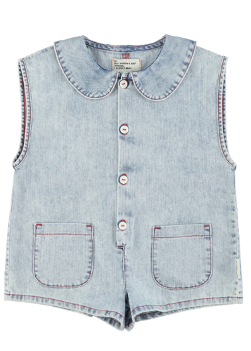 Valorar Short sleeveless jumpsuit | blue light denim w/ apple print