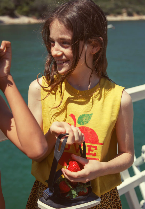 Sleeveless top | mustard w/ apple print
