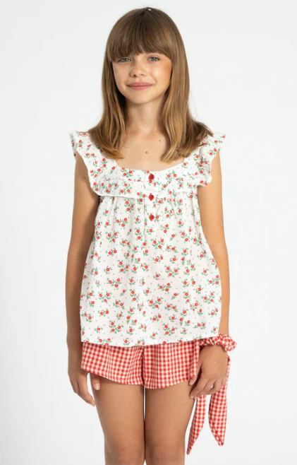 Sleeveless blouse | ecru w/ red flowers allover