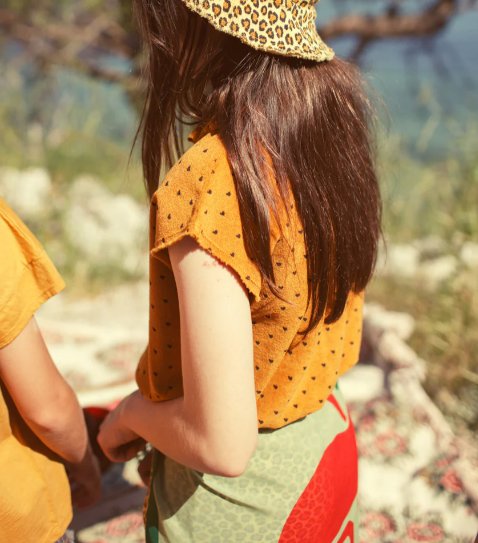 Sleeveless top w/collar| camel w/ black hearts allover